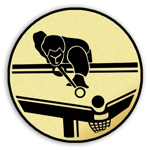 Tištěný emblém billiard, průměr 30 mm. Jedná se o zlatou samolepku s černým potiskem. Emblémy se lepí do medailí, kokard, plaket, trofejí a na víka pohárů.