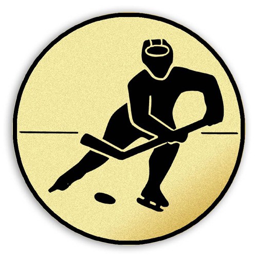 Tištěný emblém hokej, průměr 30 mm. Jedná se o zlatou samolepku s černým potiskem. Emblémy se lepí do medailí, kokard, plaket, trofejí a na víka pohárů.