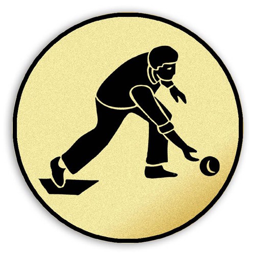 Tištěný emblém kuželky muž, průměr 40 mm. Jedná se o zlatou samolepku s černým potiskem. Emblémy se lepí do medailí, kokard, plaket, trofejí a na víka pohárů.
