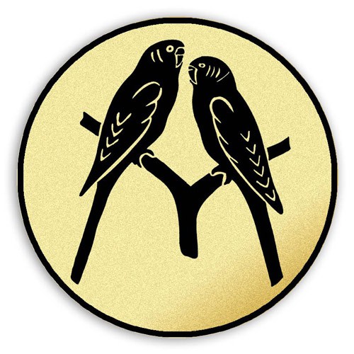 Tištěný emblém papoušci, průměr 40 mm. Jedná se o zlatou samolepku s černým potiskem. Emblémy se lepí do medailí, kokard, plaket, trofejí a na víka pohárů.