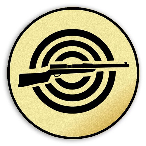 Tištěný emblém střelba puška; průměr 40 mm. Jedná se o zlatou samolepku s černým potiskem. Emblémy se lepí do medailí, kokard, plaket, trofejí a na víka pohárů.