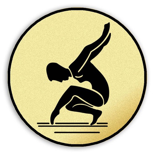 Tištěný emblém gymnastika, průměr 80 mm. Jedná se o zlatou samolepku s černým potiskem. Emblémy se lepí do medailí, kokard, plaket, trofejí a na víka pohárů.