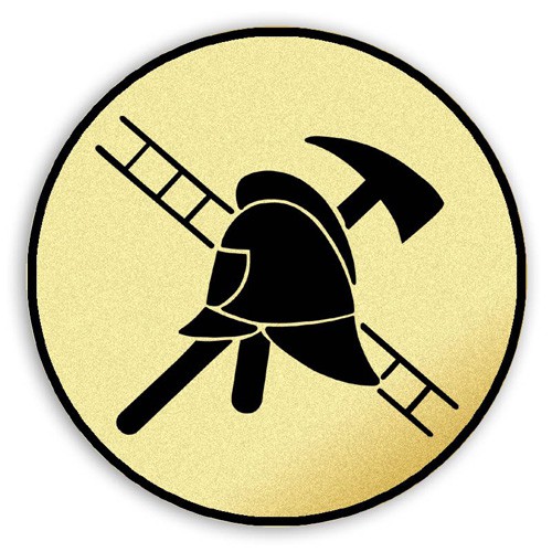 Tištěný emblém Hasič, průměr 90 mm. Jedná se o zlatou samolepku s černým potiskem. Emblémy se lepí do medailí, kokard, plaket, trofejí a na víka pohárů.