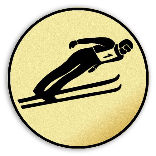 Tištěný emblém Skoky na lyžích, průměr 90 mm. Jedná se o zlatou samolepku s černým potiskem. Emblémy se lepí do medailí, kokard, plaket, trofejí a na víka pohárů.