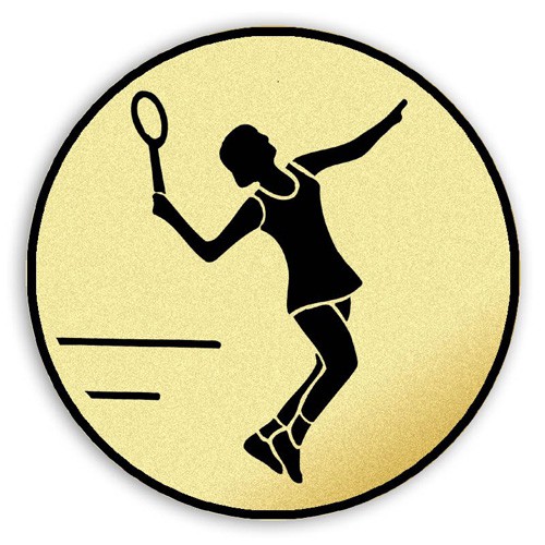 Tištěný emblém Tenis žena, průměr 90 mm. Jedná se o zlatou samolepku s černým potiskem. Emblémy se lepí do medailí, kokard, plaket, trofejí a na víka pohárů.