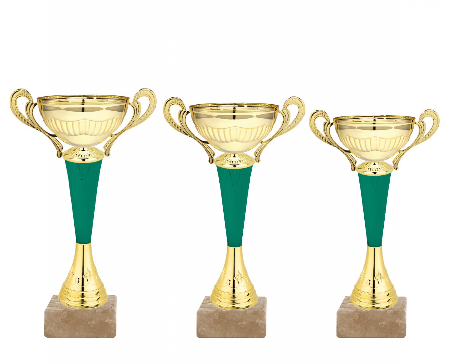 Sportovní poháry S001 Green bez víka celá sada 3 kusů, barva zlatá, výška bez víka 28 cm, 27 cm, 24 cm, velikost kalichu 120 mm, barva nohy zelená. Maximální velikost potisku štítku na podstavec je 75 x 25 mm.