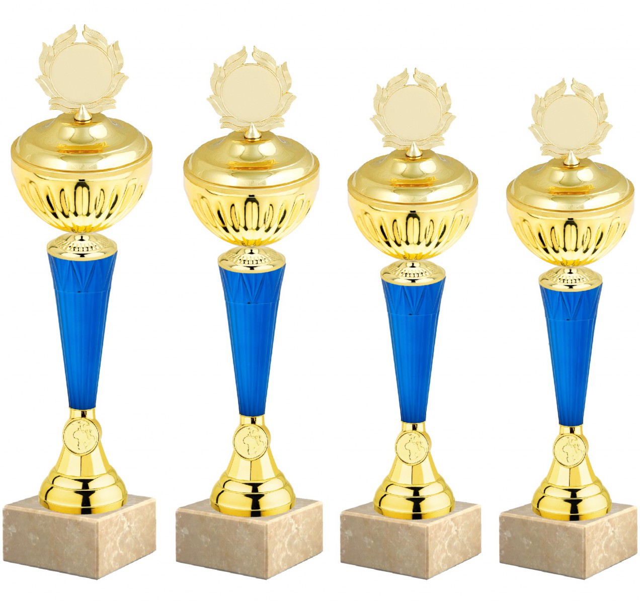 Sportovní poháry S002 BLUE celá sada 4 kusů, barva zlatá, výška s víkem 45cm; 44 cm; 42 cm; 40 cm, velikost kalichu 140, 120, 100 mm, barva nohy modrá. Maximální velikost potisku štítku na podstavec je 75 x 25 mm.