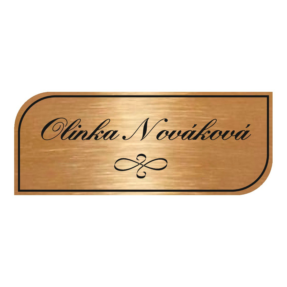 Dveřní štítek z dvouvrstvého plastu v bronzovém provedení. Vlastní text je vypálen z jedné strany laserovým paprskem, kdy odpálením vrchní vrstvy se odkryje základní vrstva černé barvy. Rozměr štítku je 100 x 40 mm a síla 1,6 mm s možností podlepení nebo vyvrtaných otvorů po stranách k přišroubování k podkladu. Dveřní štítky můžeme dodat včetně oboustranné lepicí pásky, pomocí které připevníte štítek na jakýkoliv hladký povrch. Jestli budete chtít jmenovku na dveře upevnit pomocí šroubů, vyberete tento požadavek v objednávce, vytvoříme dírky pro šrouby.