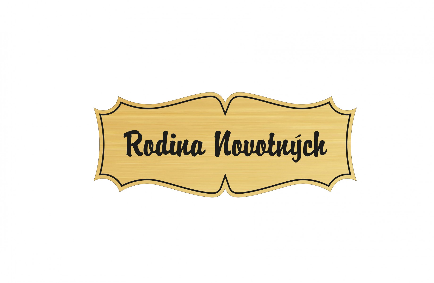 Dveřní štítek z dvouvrstvého plastu ve zlatém provedení. Vlastní text je vypálen z jedné strany laserovým paprskem, kdy odpálením vrchní vrstvy se odkryje základní vrstva černé barvy. Rozměr štítku je 100 x 40 mm a síla 1,6 mm s možností podlepení nebo vyvrtaných otvorů po stranách k přišroubování k podkladu. Dveřní štítky můžeme dodat včetně oboustranné lepicí pásky, pomocí které připevníte štítek na jakýkoliv hladký povrch. Jestli budete chtít jmenovku na dveře upevnit pomocí šroubů, vyberete tento požadavek v objednávce, vytvoříme dírky pro šrouby.
