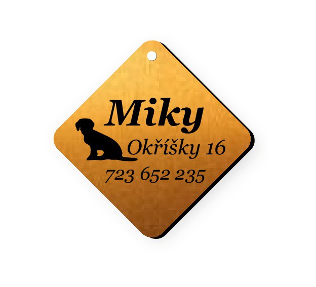 Psí známka je ve tvaru čtyrúhelníku vyrobena z dvouvrstvého plastu o rozměru 35x35 mm a s otvorem pro kroužek k uchycení na obojek. Popis psí známky se provádí vygravírováním čísla, nápisu nebo loga z jedné strany. Barva vygravírovaného čísla má shodnou barvu jako druhá strana klíčenky. Barva psí známky je bronzová.