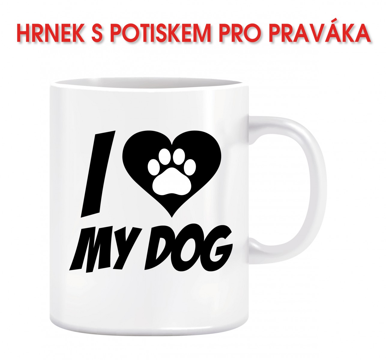 Hrnek I love my dog potištěný z pravé strany sublimací do glazury. V ceně výrobku je bílý keramický hrnek s potiskem.