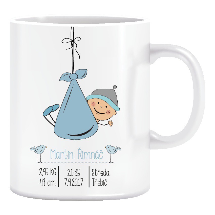 Bílý keramický hrnek k narození miminka M01 potištěný z pravé strany sublimací do glazury. V ceně výrobku je bílý keramický hrnek s potiskem.