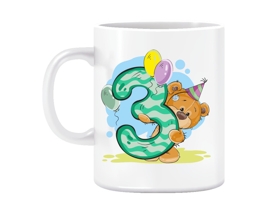 Bílý keramický hrnek k narozeninám 3 roky potištěný z levé strany sublimací do glazury. V ceně výrobku je bílý keramický hrnek s potiskem.