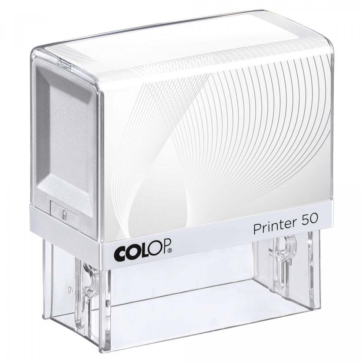 Plastové samobarvící razítko Colop printer 50 je kompletní s gumovým štočkem a polštářkem, velikost otisku 70x30 mm, barva krytu bílá. Razítko pro maximálně 8 řádků tisku.