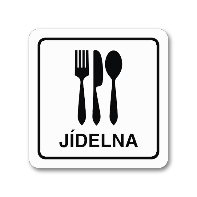Piktogram jídelna samolepka s potiskem v bílé barvě. Piktogram o rozměru 80x80 mm o síle 0,2 mm je samolepící a vhodný na hladké podklady.
