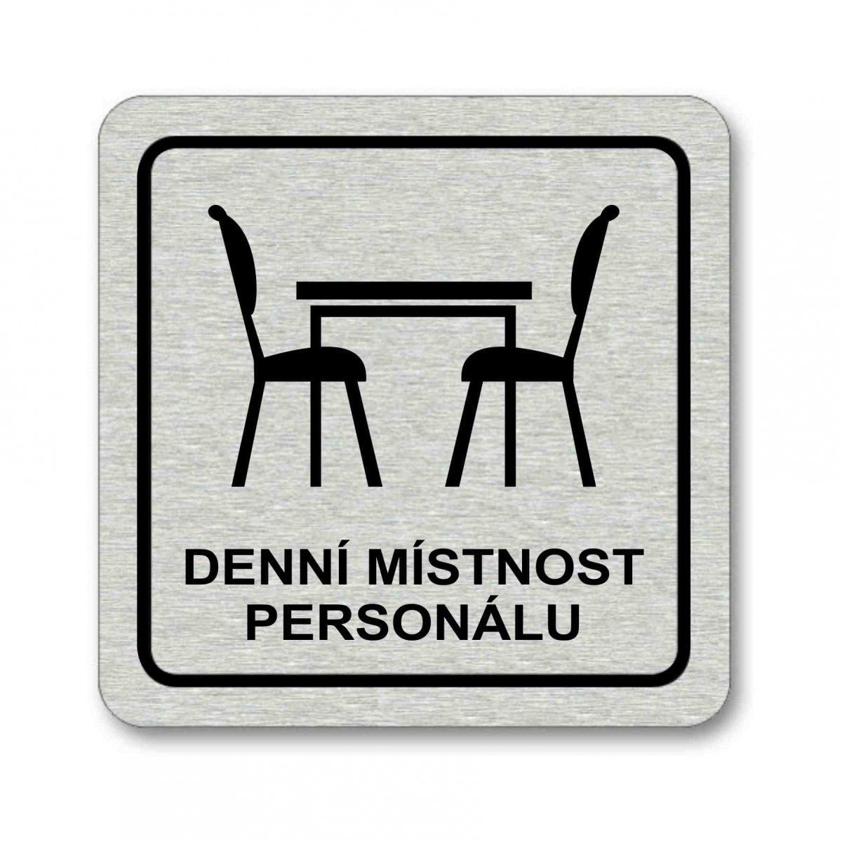 Piktogram denní místnost personálu je zhotoven sublimačním potiskem eloxovaného hliníku ve stříbrné barvě. Piktogram o rozměru 80x80 mm o síle 0,8 mm a vhodný na všechny druhy podkladů.