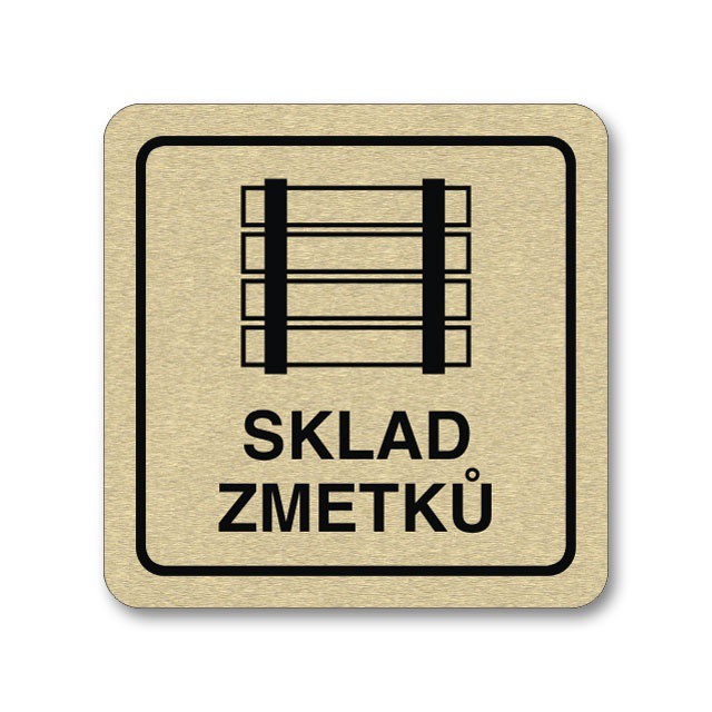 Piktogram sklad zmetků je zhotoven sublimačním potiskem eloxovaného hliníku ve zlaté barvě. Piktogram o rozměru 80x80 mm o síle 0,8 mm a vhodný na všechny druhy podkladů.