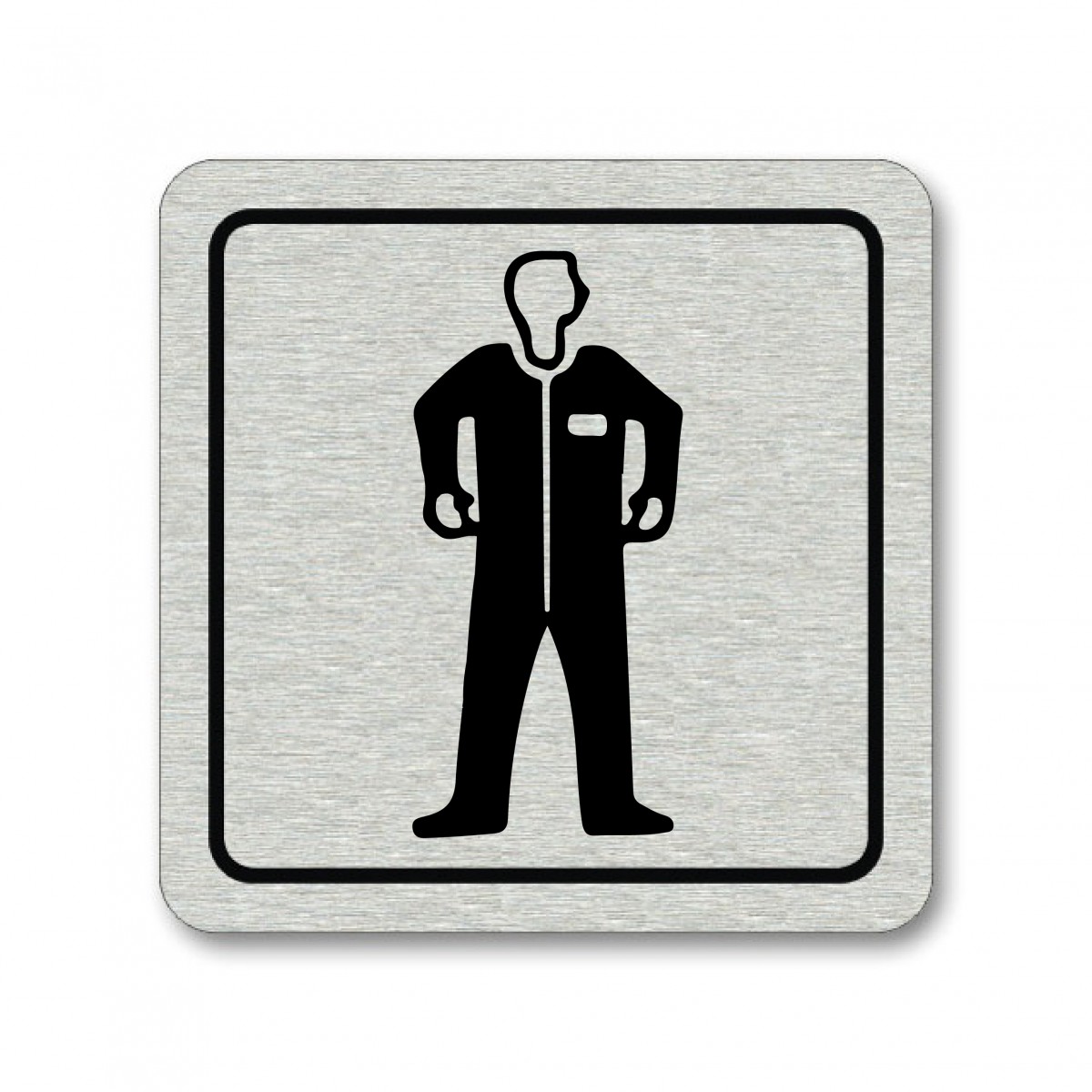 Piktogram Ochranný oblek je zhotoven sublimačním potiskem eloxovaného hliníku. Piktogram o rozměru 80x80mm o síle 0,8 mm je zezadu opatřen samolepící oboustrannou páskou. Výrobek je určen do interiéru.