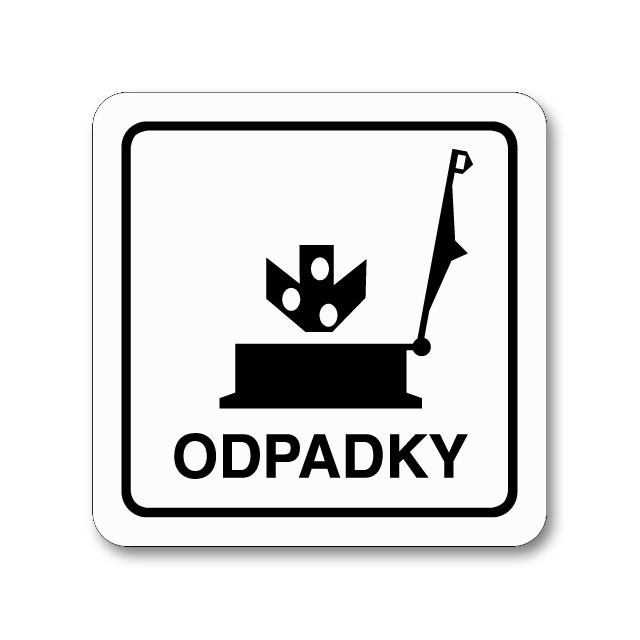 Piktogram odpadky je zhotoven sublimačním potiskem eloxovaného hliníku ve stříbrné barvě. Piktogram o rozměru 80x80 mm o síle 0,8 mm je zezadu opatřen samolepící oboustrannou páskou. Barva hliníkového štítku je stříbro. Výrobek je určen do interiéru.