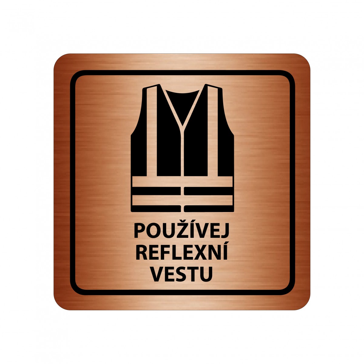 Piktogram Používej reflexní vestu je zhotoven sublimačním potiskem eloxovaného hliníku. Piktogram o rozměru 80x80mm o síle 0,8 mm je zezadu opatřen samolepící oboustrannou páskou. Výrobek je určen do interiéru.