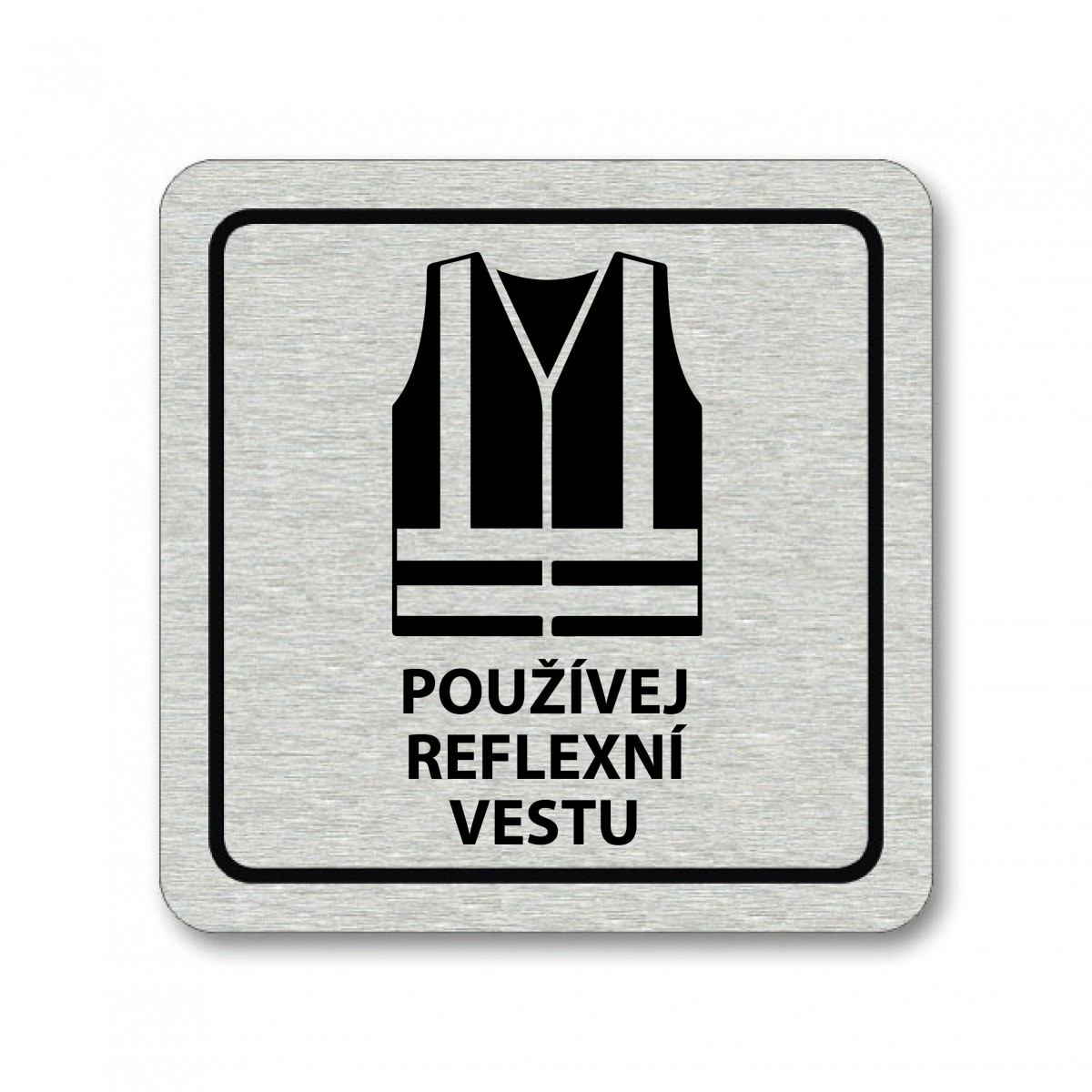 Piktogram Používej reflexní vestu je zhotoven sublimačním potiskem eloxovaného hliníku. Piktogram o rozměru 80x80mm o síle 0,8 mm je zezadu opatřen samolepící oboustrannou páskou. Výrobek je určen do interiéru.