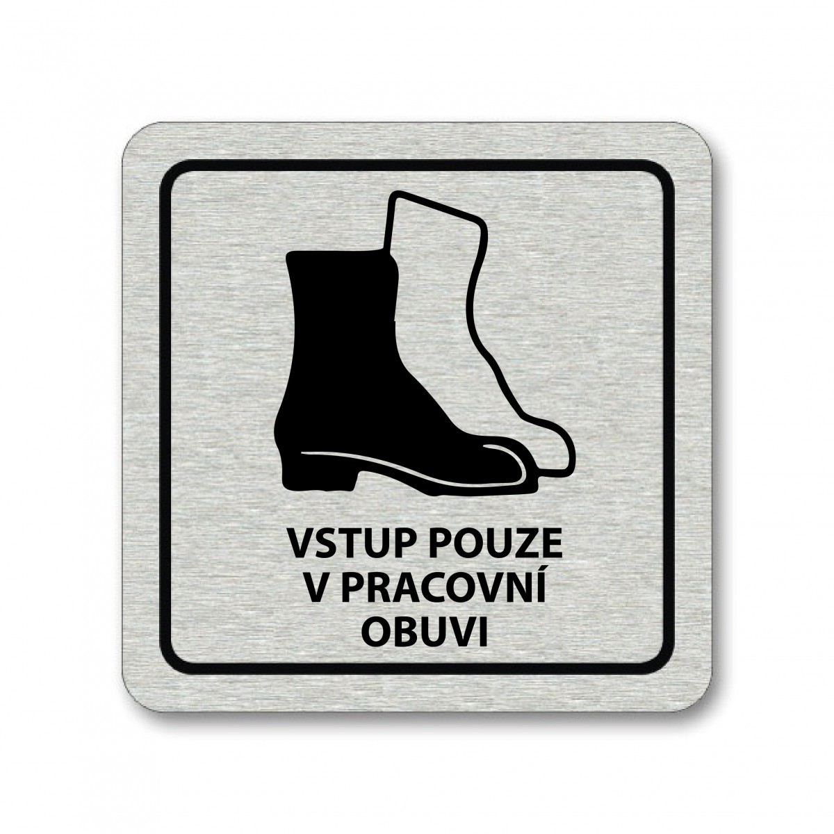 Piktogram Vstup v pracovní obuvi je zhotoven sublimačním potiskem eloxovaného hliníku. Piktogram o rozměru 80x80mm o síle 0,8 mm je zezadu opatřen samolepící oboustrannou páskou. Výrobek je určen do interiéru.