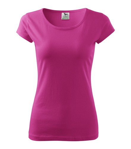 Dámské tričko PURE růžové je kvalitní reklamní tričko gramáže (150 g/m2). Volný kulatý průkrčník s úzkým lemem ze shodného materiálu.