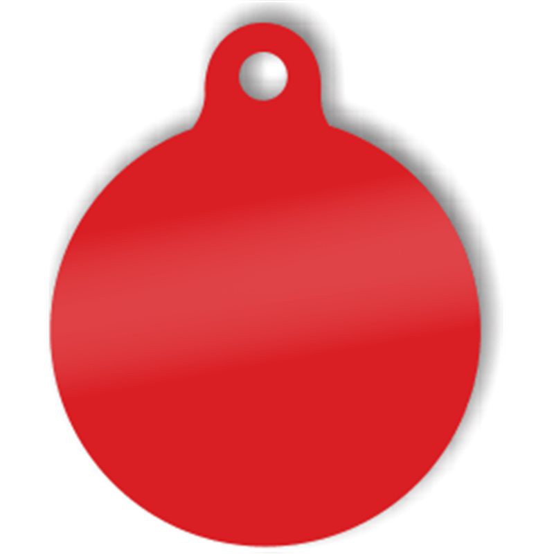 Psí známka ve tvaru kolečka z leštěného eloxovaného barevného hliníku v červené barvě o průměru 27 mm s otvorem pro kroužek k uchycení na obojek o průměru 3 mm.