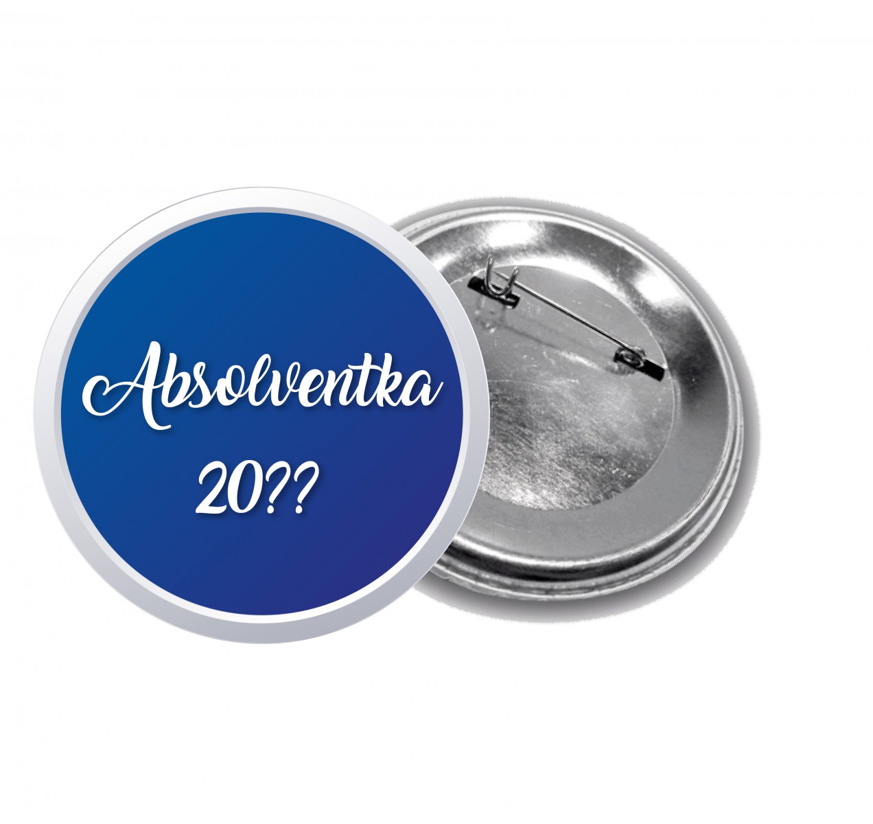 Placka absolventka tmavě modrá o průměru ⌀ 56 mm. Placky jsou z kovu, opatřeny spínacím špendlíkem, tisková strana je krytá průhlednou lesklou fólii pro ochranu a efektnější vzhled motivu.