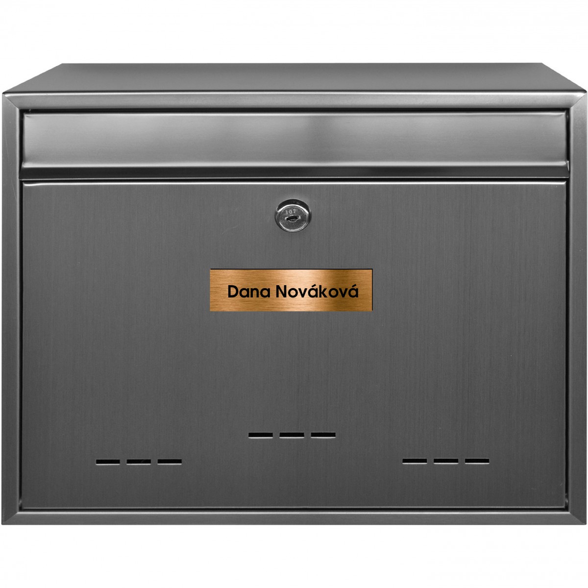 Štítek na schránku je z eloxovaného hliníku o rozměru 60 x 20 mm a síle, 0,56 mm.