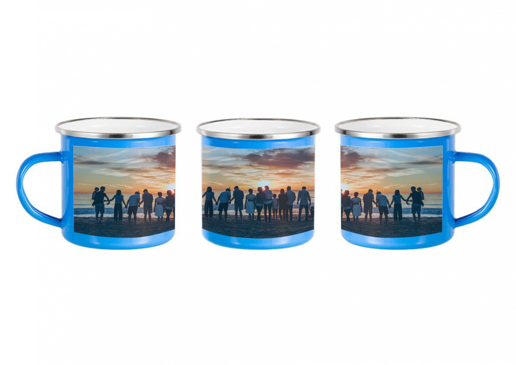 Plechový smaltovaný modrý hrnek s nerezevým lemem s vlastním potiskem, fotkou nebo textem.