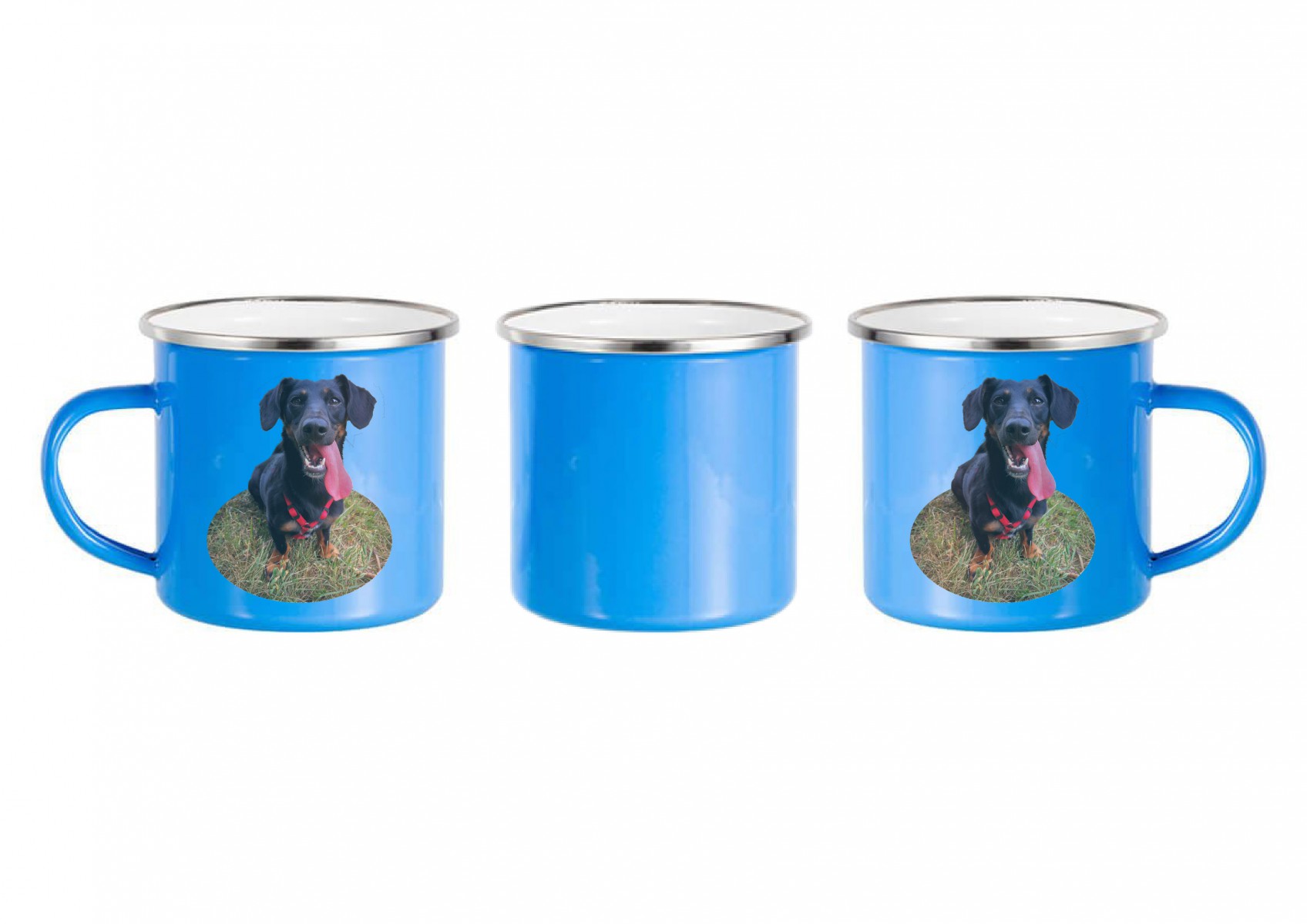 Plechový smaltovaný modrý hrnek s nerezevým lemem s vlastním potiskem, fotkou nebo textem.