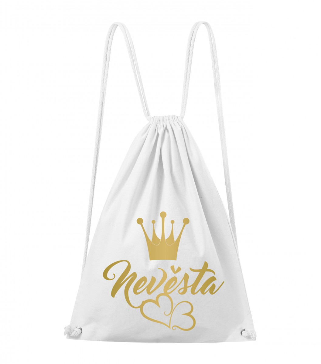 Lehký moderní a praktický svatební batoh/vak s potiskem nositelný na rameni nebo na zádech. Tkaný plátěný bavlněný batoh/gymsack se zavíráním na 2 bavlněné stahovací šňůrky v barvě vrchového materiálu. Dolní rohy jsou zpevněné dvojitým materiálem a kovovými kroužky. Uvnitř batohu najdete praktickou menší kapsu na zip o rozměru 20 x 23 cm.