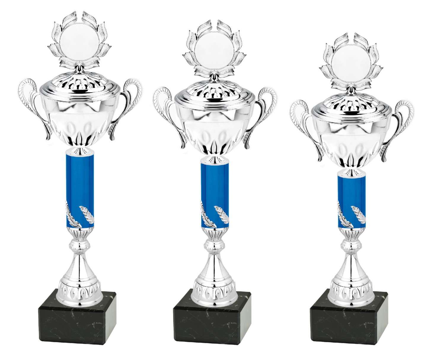 Poháry celá sada 3 kusů, barva stříbrná, výška s víkem 57 cm, 55 cm, 53 cm, velikost kalichu 140 mm s terčem 50 mm, barva nohy stříbrná. Maximální velikost potisku štítku na podstavec je 95 x 45 mm. Poháry neobsahují emblém. Cena pohárů je bez emblému.