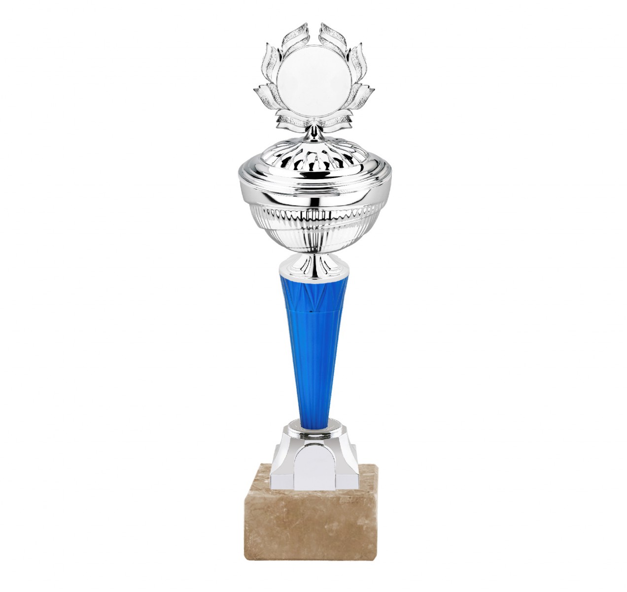 Pohár samostatný, barva stříbrná, výška s víkem 33 cm, velikost kalichu 90 mm s terčem 25 mm ve víku a v noze místo na 25 mm emblém, barva nohy modrá. Maximální velikost potisku štítku na podstavec je 60 x 25 mm. Pohár neobsahuje emblém. Cena poháru je bez emblému.
