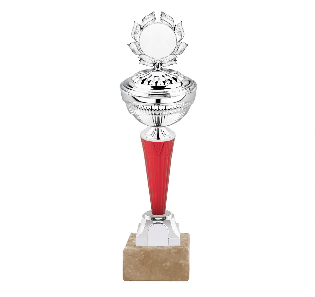 Pohár samostatný, barva stříbrná, výška s víkem 33 cm, velikost kalichu 90 mm s terčem 25 mm s možností umístění emblému 25 mm ( viz. sekce EMBLÉMY ) a s možností umístění emblému 25 mm ( viz. sekce EMBLÉMY ) do nohy, barva nohy červená. Maximální velikost potisku štítku na podstavec je 60 x 25 mm ( jednotlivé ceny štítků naleznete v sekci ŠTÍTKY ). Pohár neobsahuje emblém. Cena poháru je bez emblému.