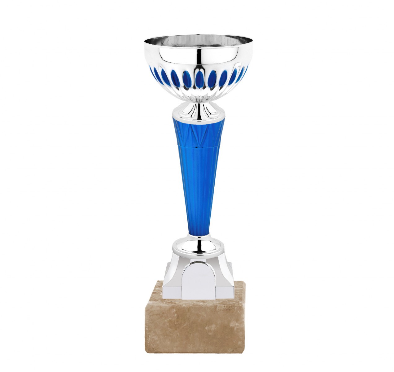 Poháry Si015.1 BLUE bez víka, barva stříbromodrá, výška bez víka 27 cm, velikost kalichu 100 - 80 mm a v noze místo na 25 mm emblém, barva nohy modrá. Maximální velikost potisku štítku na podstavec je 60 x 25 mm. Poháry neobsahují emblém. Cena pohárů je bez emblému.