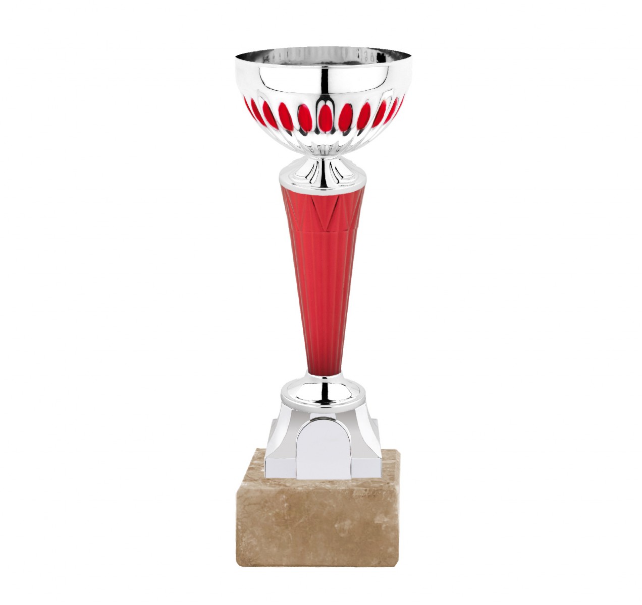 Poháry Si015.1 ROSSO bez víka, barva stříbročervená, výška bez víka 27 cm, velikost kalichu 100 - 80 mm a v noze místo na 25 mm emblém do nohy, barva nohy červená. Maximální velikost potisku štítku na podstavec je 60 x 25 mm. Poháry neobsahují emblém. Cena pohárů je bez emblému.