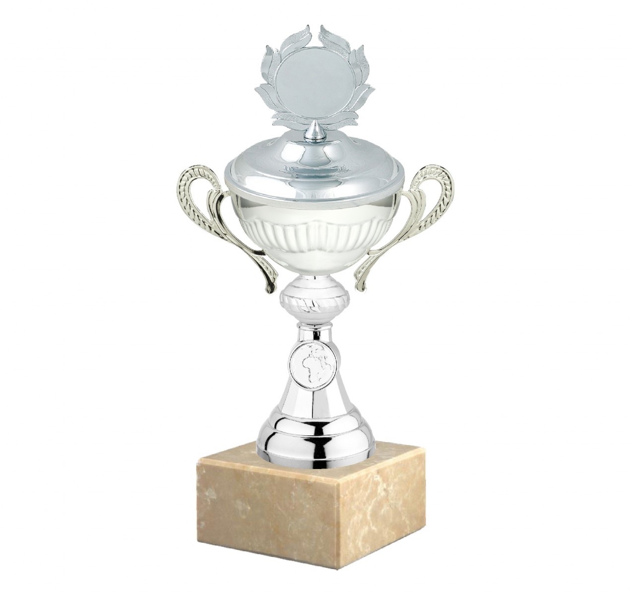 Sportovní pohár Si009.3 s víkem, barva stříbrná, výška s víkem 24 cm, velikost kalichu 80 mm s terčem 25 mm s možností umístění emblému 25 mm a s možností umístění emblému 25 mm do nohy. Maximální velikost potisku štítku na podstavec je 60 x 25 mm.